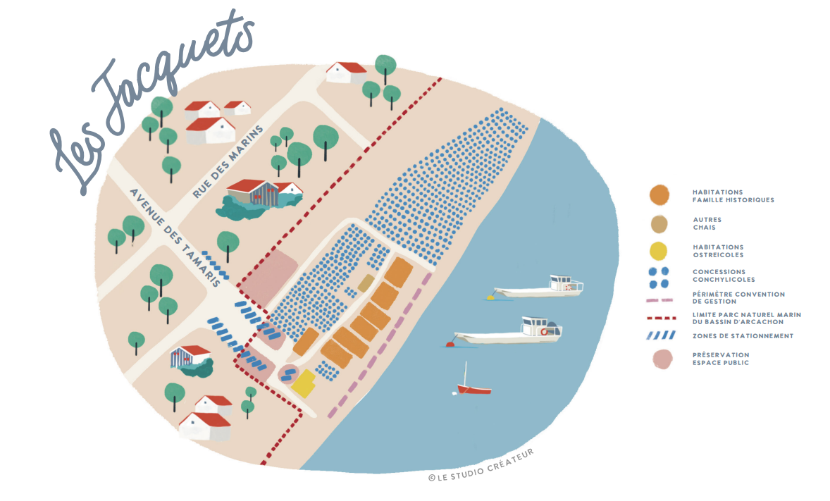 On peut traverser les deux parties Nord et Sud de ce discret village de 500 m de long, niché entre le Four et Petit Piquey. Les Jacquets abrite l'ancien réservoir à poissons et le cuvier à vin du sieur Lesca. Il doit son nom à un oiseau bien connu des anciens: « la Jaquet » (« la bécasse » en gascon). Le port ostréicole se déploie le long d'une anse dans un décor qui rappelle le marais d'autrefois, quand il s'appelait encore « Terre Blanque ». C'est un endroit paisible qui invite à la détente le long des conches tranquilles, au pied des cabanes. Trouvez le bon spot pour poser votre serviette, mais soyez attentif : si un ostréiculteur veut amarrer sa plate, allez l'aider. Vous vous ferez peut être un ami qui vous racontera les histoires du pays...